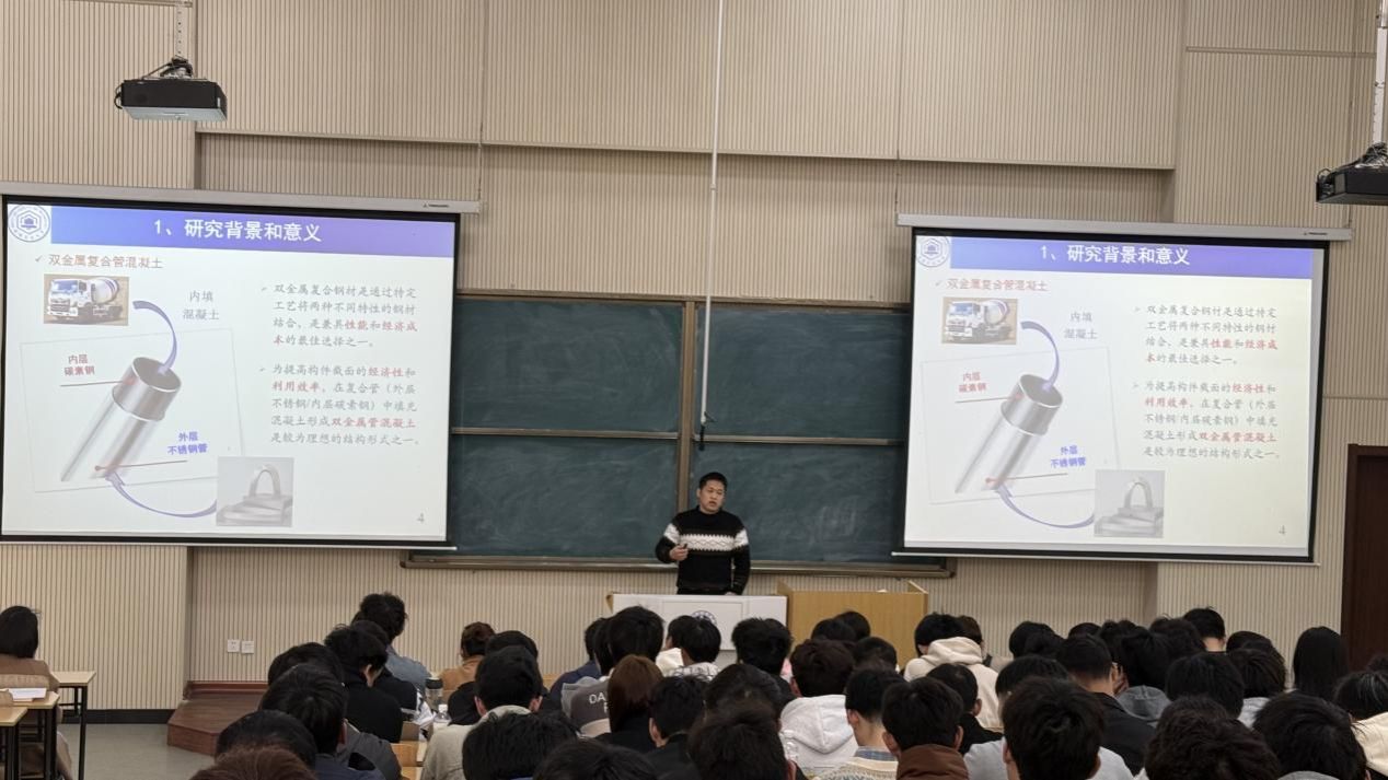 活动期间,安徽工业大学的张世江博士带来了关于 “双金属复合管混凝土结构研究进展” 的主题讲座。张老师凭借深厚的专业知识,深入浅出地阐述了双金属复合管混凝土结构在国内外的研究现状,详细分析了该结构在实际工程应用中的优势及面临的挑战。通过丰富的案例和直观的图表展示,学生们对这一前沿领域有了更清晰的认知,张世江博士不仅解释了技术细节,还分享了个人在科研过程中的经验和心得。这种面对面的交流方式极大地激发了同学们的学习热情和探索精神,使他们深刻体会到理论与实践相结合的重要性。通过这次互动,同学们不仅拓宽了知识面,还增强了解决实际问题的能力,为未来的科研工作打下了坚实的基础。