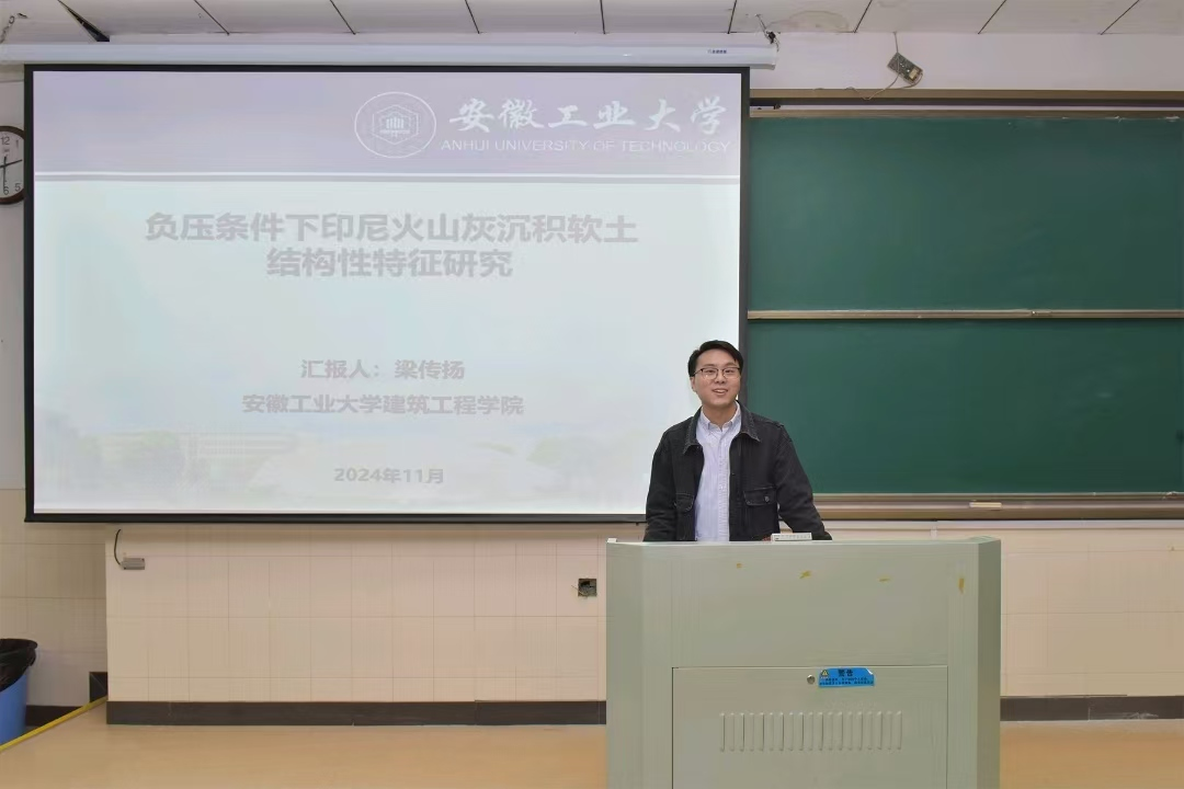 随后,由安徽工业大学老师们带来了一系列精彩的学术报告。这些报告不仅涵盖了土木工程的基础理论,也包括了该领域的前沿应用,为学生们提供了一个全面了解行业动态和学术进展的平台。其中,梁传扬博士的报告尤为引人注目,他深入剖析了负压条件下印尼火山灰沉积软土的结构性特征,这一研究对于理解和预测软土地基在特殊环境下的行为具有重要意义。梁博士的报告不仅展示了他在该领域的深厚研究,也为学生们提供了一个将理论知识与实际工程问题相结合的范例。